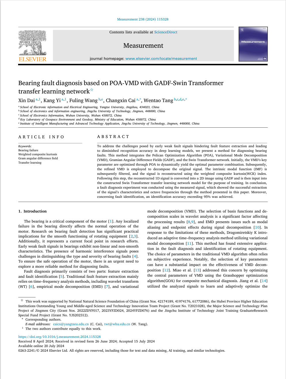 公司唐文涛教授研究团队,在基于人工智能的电机故障诊断领域取得重要进展。研究成果“Bearing Fault Diagnosis Based on POA-VMD with GADF-Swin Transformer Transfer Learning Network”在国际著名学术期刊Measurement上发表。Measurement是ELSEVIER旗下的国际权威期刊,主要刊发故障诊断与仪器仪表等方面的最新进展和评论文章,为中科院SCI二区TOP期刊,最新影响因子为5.2。论文第一作者为2023级联培研究生戴鑫与2021级联培研究生易康,导师唐文涛教授和长江大学蔡昌新副教授为该文通讯作者。
