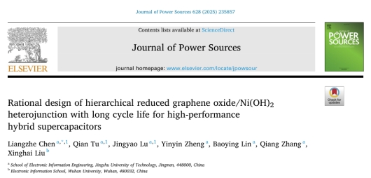 近日,伟德bv1946官网陈良哲博士/副教授在国际能源领域Top期刊《Journal of Power Sources》上发表研究最新研究成果,题为“Rational design of hierarchical reduced graphene oxide/Ni(OH)2 heterojunction with long cycle life for high-performance hybrid supercapacitors”。论文的第一作者/通讯作者为陈良哲副教授,研究生涂倩和本科生鲁晶瑶为的共同第一作者,bv伟德国际1946是论文的第一通讯单位。该论文还获得湖北省高等公司优秀中青年科技创新团队项目和荆门市科技计划项目的资助。《Journal of Power Sources》刊物致力于发表关于电源技术、能源存储与转换等方面的研究和发展,2023-2024最新影响因子为8.1,属于JCR Q1分区、中科院2区的Top期刊,在能源领域方面具有极高的影响力。