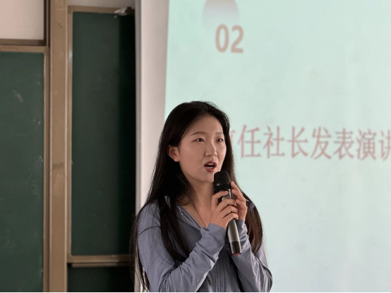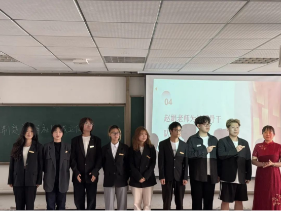 随后,指导教师赵娟为辩论队骨干成员授队牌、授旗并发表讲话。赵娟老师宣布了荆楚思辨社社团成立,她希望同学们能在这里以理性的态度、批判的思维,探讨各种问题,提升思考力和表达力,并在全体成员的共同努力下,为公司辩论和学术交流增添浓墨重彩的一笔,共同书写荆楚思辨社的美好未来。